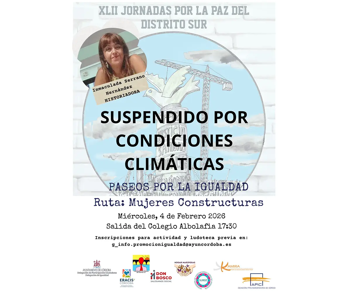 Paseos por la Igualdad – Ruta: Mujeres Constructoras, actividad incluida en las XLII Jornadas por la Paz del Distrito Sur, queda suspendida por previsión de lluvia, tal y como se indica en la información facilitada.