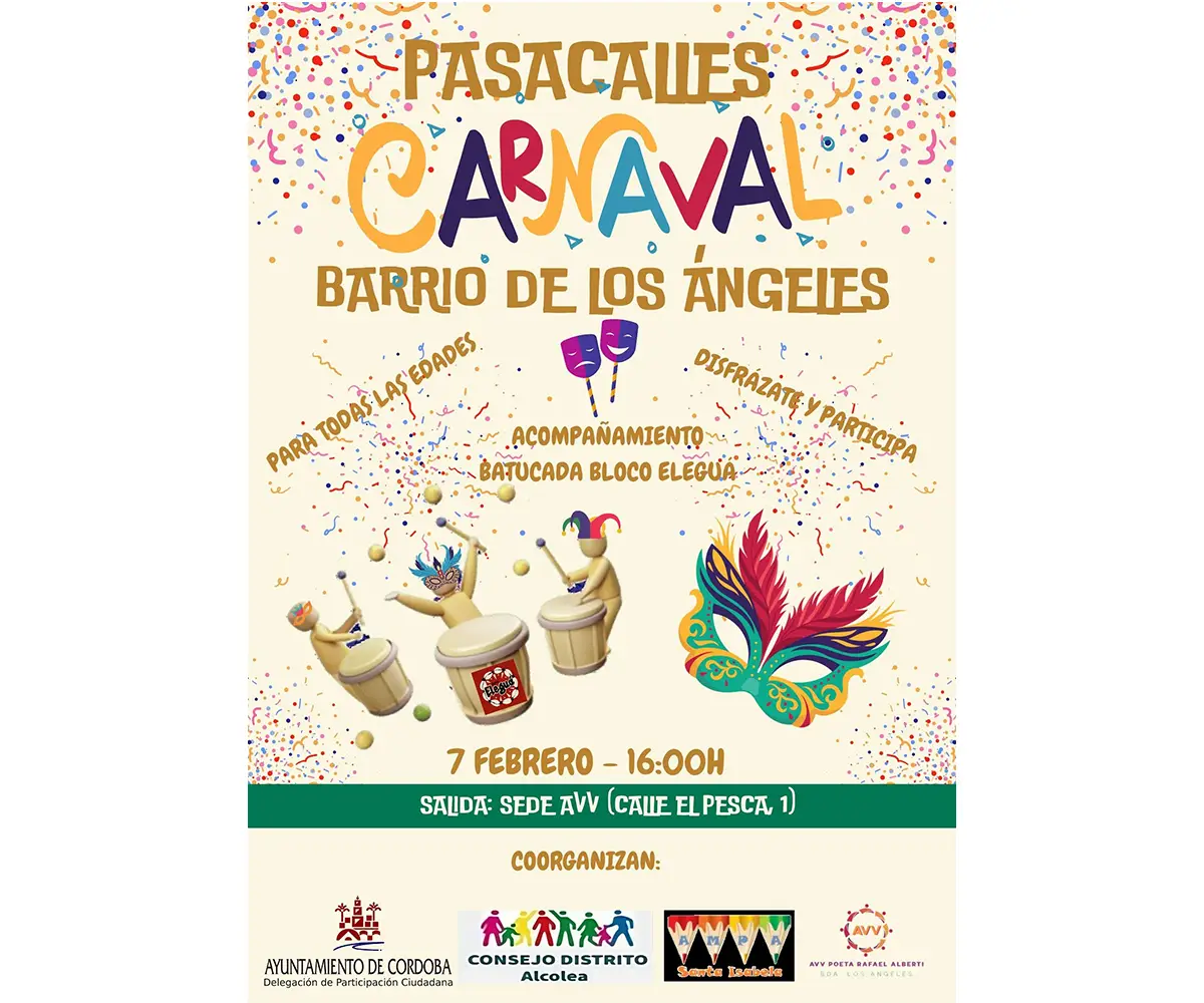 El Carnaval llena de color, ritmo y alegría las calles de la Barriada de Los Ángeles con un gran pasacalles para todas las edades. Una cita perfecta para disfrazarte, salir a la calle y disfrutar en comunidad, acompañados por la energía y el sonido contagioso de la batucada Bloco Eleguá. 🥁🎶