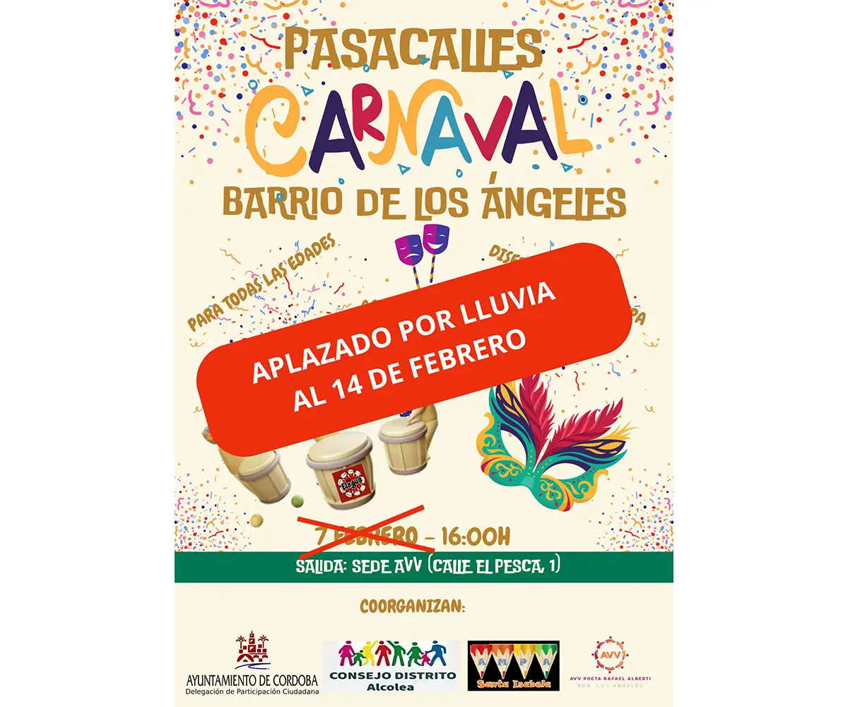 Debido a la previsión de lluvia, se ha aplazado el Pasacalles de la Barriada de Los Ángeles del 7 al 14 de febrero.